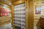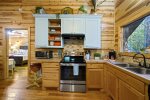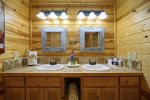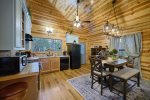 The chic farmhouse look continues indoors, pairing quaint, farm fresh style with modern amenities. The contemporary open concept allows you to soak everything in from the soaring vaulted ceilings and organic, lodge-look wood floors and walls to the vintage appeal of the down-to-earth style coupled with playful colors. Part of the charm in a true farmhouse is the way old pieces are given new life or new purpose. You can see this aspect throughout the cabin, with gorgeous pieces expertly paired with hand selected vintage accents and artwork that imbues the space with character and warmth.