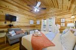 Within the beautiful and serene Timber Creek Trails South on a quiet cul-de-sac, this pristine cabin emerges from the clearing like a fantasy come true. From the raw, natural covered front porch, comfortably furnished for mornings spent sipping your coffee to the sights and sounds of nature, to the exterior farmhouse style finishes, this 1-bedroom luxury honeymoon cabin is an instant charmer.