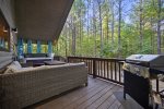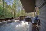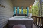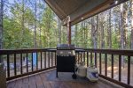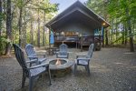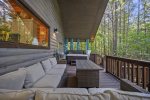 Among its many unique features is the large covered back porch, presented as an oasis of calm, outfitted with a gas grill, four-person hot tub and an outside dining table for four guests. It opens to expansive views of the surrounding great pines, with direct flow down to the ground level fire pit that's perfect for quenching those s'more cravings or star gazing to the warmth of the crackling flames.