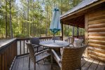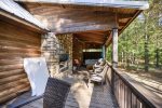 Proceed outside where you will find a partially covered wrap-around deck fully prepared with your enjoyment in mind. An alfresco dining for six is right nearby with sun umbrella for protection from the elements should you need it. Down on the ground level, a custom fire pit rounds out the remarkable outdoor features, leaving no stone unturned to assure your stay is one of ease and merriment.