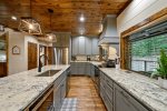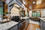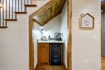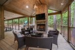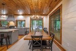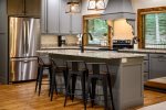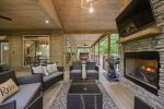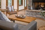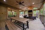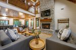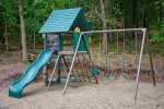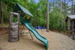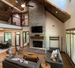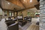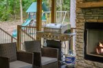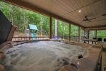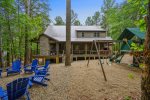 True open concept with access to the covered exterior deck makes the entire space comfortable, livable, and functional. This elite outdoor space is an easy extension of the indoors luxe amenities, with emphasis on beauty and comfort. The vaulted alfresco lounge nestles itself around the warmth of a stacked stone fireplace with plenty of seating to settle in while sharing and making memories. The propane grill is just waiting for you to whip up your favorite barbeque treats, with nearby dining area in which to savor the fare. The jets of the covered hot tub create a siren call for therapeutic R&R after a long day of hiking, water play, and other sightseeing adventures. Stairs off the deck lead down to the fire pit, of which is ringed by chairs where you might wish to toast up some s'mores, retell a classic ghost story, recant the excitement of the day, or make plans for the days to come. While you sit back and rest, children will have a grand time entertaining themselves on the playground. Swings for young and old, plus a clubhouse and rock wall will call to their sense of imaginative play and will have them play-acting anything from space adventure to pirates searching for buried treasure. The adults might even choose to strike up a game of cornhole while the little ones are busy chasing imaginary dragons.