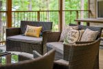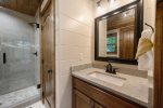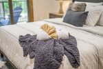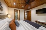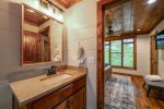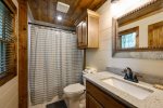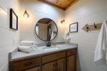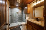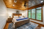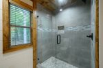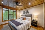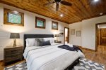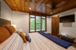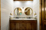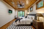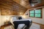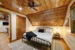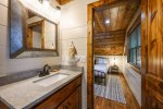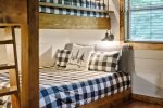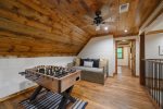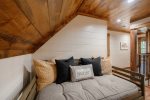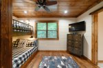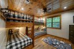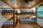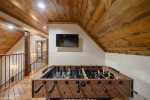 The staircase with wooden treads and wrought iron rails exudes a sophisticated airiness as you head upstairs to the three additional master bedrooms with ensuite bathrooms, loft area, and bunk room. The loft area is like an extension of the game room, complete with foosball table, TV and couch/trundle bed. Three additional king suites share this second level, each with their own sumptuous ensuite bathrooms. A bunk room is all set up for the youth of the group, comprised of three twin-sized beds and one full sized bed, each with their own reading lamp for late night relaxation. No detail is overlooked, this high-end vacation cabin is awaiting your pleasure. Book your stay today to secure the chance to make your own cherished memories in this opulent-meets-rustic oasis!