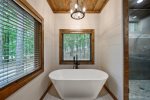 Back inside, the game room is primed for even more fun with pool table and TV for keeping up with your favorite sports teams or other televised interests. Also on this main level is the decadent king master retreat, which tailors to spa-like tastes with glamorous ensuite bath yielding dual sinks, an oversized walk-in shower, and separate freestanding soaking tub surrounded by wooded views.